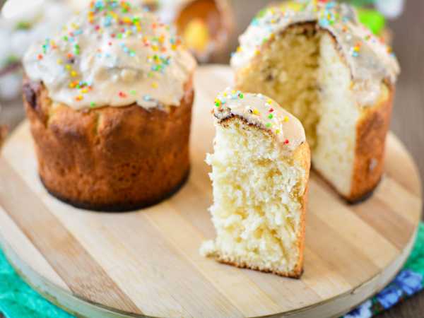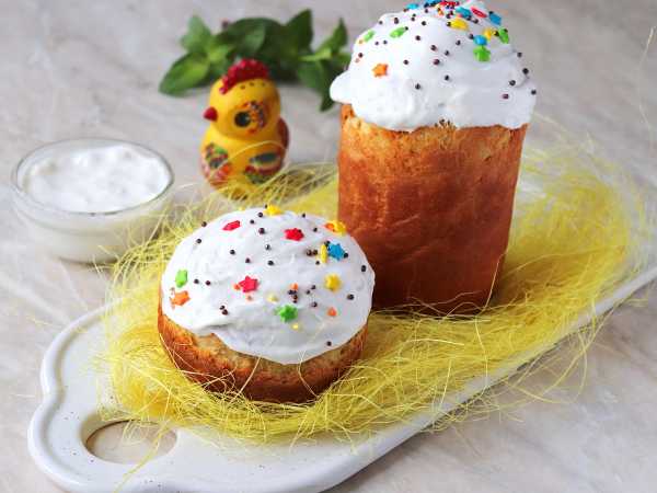 Готовые куличи остудите, затем украшайте любой глазурью и разноцветными присыпками. Приятного аппетита!