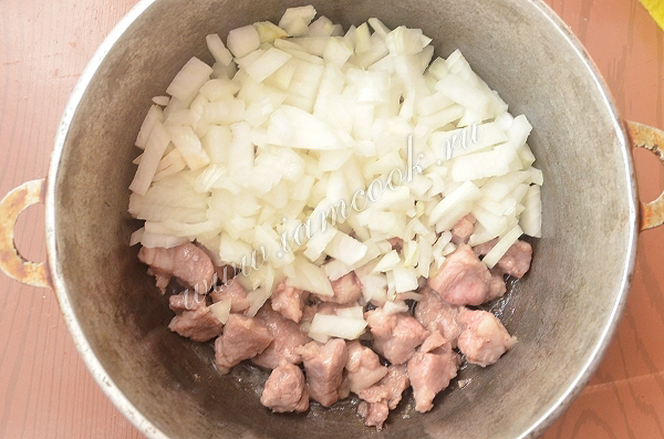 Лук нарезать, добавить к мясу, обжаривать 3-4 минуты на среднем огне.