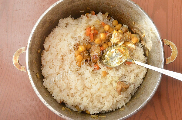 Затем добавить в казан хорошо промытый рис, специи, соль и перец. Вы можете как перемешать все ингредиенты, так и сложить их в казан слоями, тогда все специи добавьте вместе с морковью.
