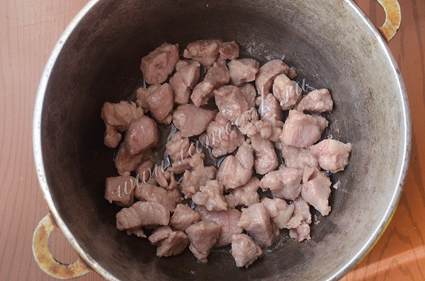 Мякоть свинины (у меня шея) нарезать небольшими кусочками, обжарить на растительном масле до золотистого цвета.