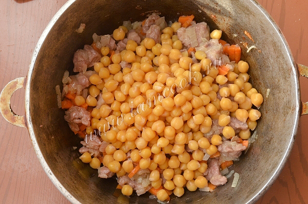 Добавить к мясу и овощам предварительно отваренный или консервированный нут. Перемешать, готовить 5 минут.