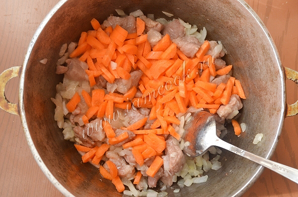 Морковь нарезать соломкой, добавить в казан. Обжаривать с мясом еще 5 минут.