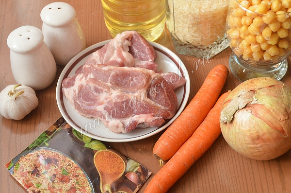 Подготовим необходимые продукты для приготовления плова со свининой и нутом.