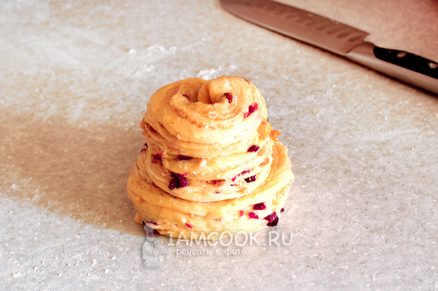 Сверните жгуты теста разрезами кверху, чтобы получилась розочка, а концы подверните внутрь.
