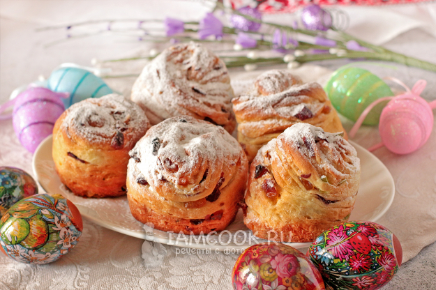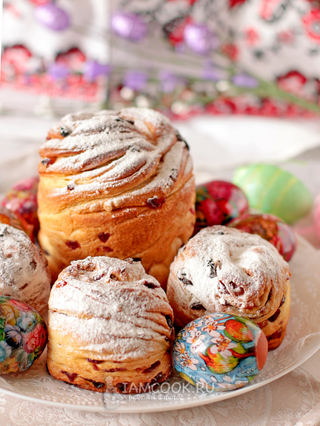 У меня вышло 8 маленьких куличиков, один средний - из двух жгутов теста, и один побольше - из двух шариков теста, которые также были раскатаны в тонкий пласт и скручены в рулет.