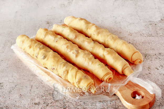 Скатайте в плотный рулет, слегка натягивая тесто. Поступите так со всеми шариками теста, и оставьте их под пленкой для расстойки на несколько минут.