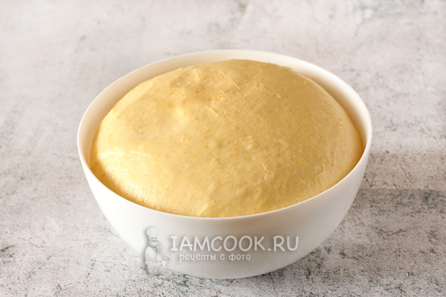 В миске соедините желтки и яйцо, оставшийся сахар и молоко, соль, растопленное масло, цедру, сок, подошедшую опару, ванилин и добавьте муку, чтобы замесить тесто.
