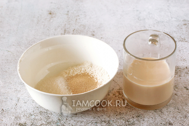 Подготовьте опару. У меня дрожжи по инструкции соединяются с мукой, поэтому соедините пару ложек муки, ложку сахара и дрожжи, перемешайте.