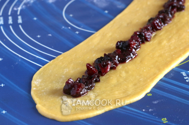 Поочерёдно каждую из 4-х частей раскатать в полоску толщиной 4-5 мм, в центр выложить полоску густого джема.