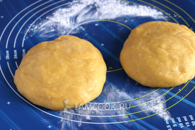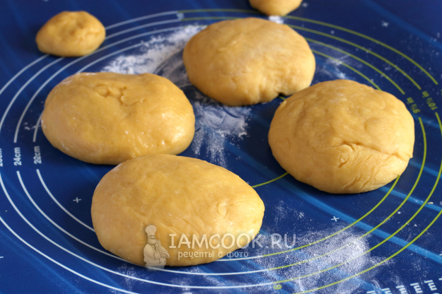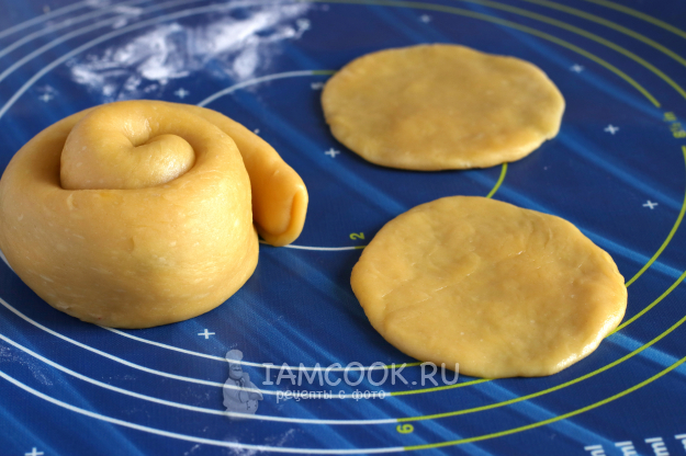 Из тех кусочков теста, которые были отщипнуты сразу, раскатать круглые лепёшки по диаметру форм, в которых будут выпекаться куличи.