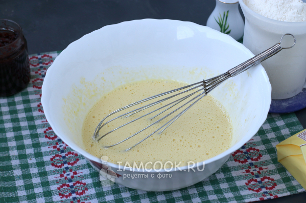 Для опары в небольшой пиале смешать дрожжи с двумя чайными ложками муки и сахара от общей массы. Добавить в смесь тёплое молоко, перемешать и прикрыть салфеткой. Оставить, пока дрожжи не поднимутся шапочкой. В глубокую миску разбить яйца, добавить сахар, ванильный сахар и тщательно взбить венчиком.
