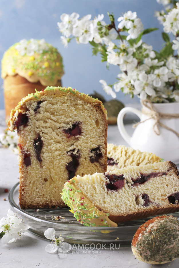 Покрыть куличи пасхальной глазурью и посыпать кондитерской посыпкой. В глазурь я для цвета добавила куркуму. В разрезе просто шикарные куличи получаются и очень вкусные.