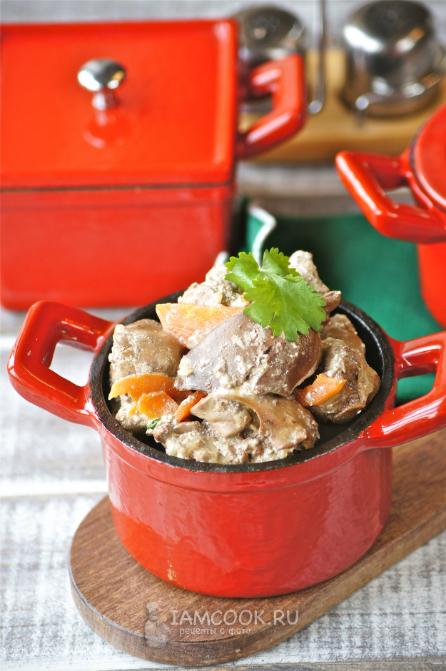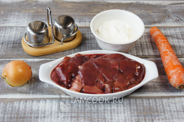 Возьмите все необходимые продукты для приготовления куриной печени в горшочках в духовке.