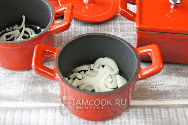 Лук очистите, нарежьте полукольцами и выложите в горшочки.