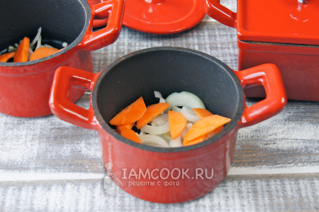 Морковь очистите, нарежьте на кусочки и выложите в горшочки.
