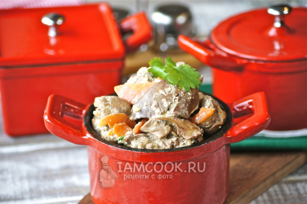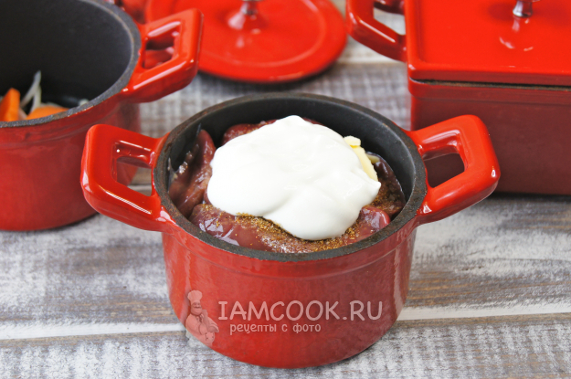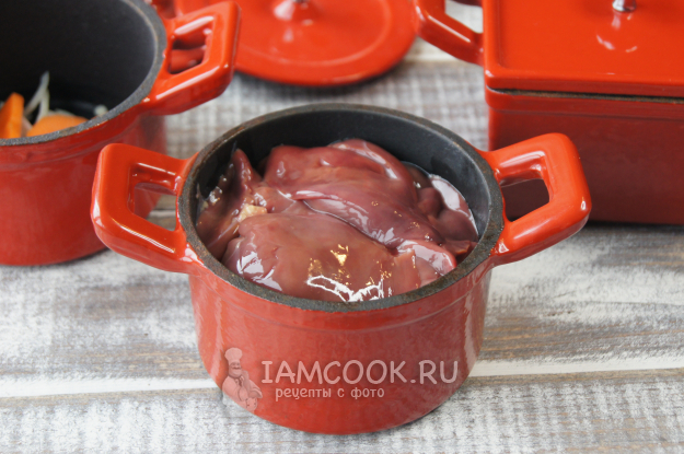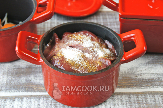 Промойте печень, по желанию нарежьте помельче и выложите в горшочки.