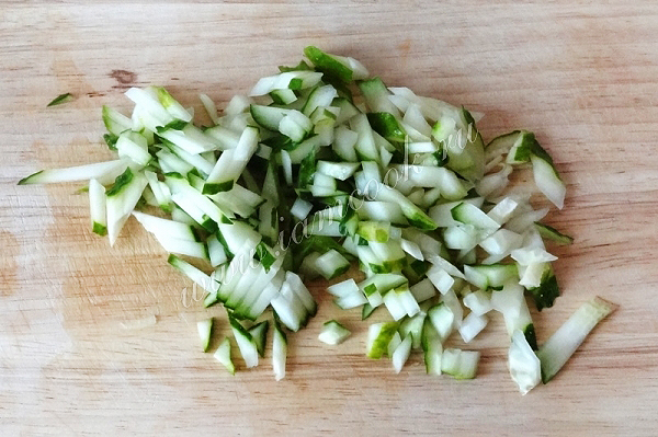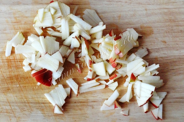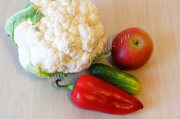 1. Необходимые продукты: цветная капуста, яблоко, огурец, перец сладкий, сметана и сахарная пудра или йогурт.