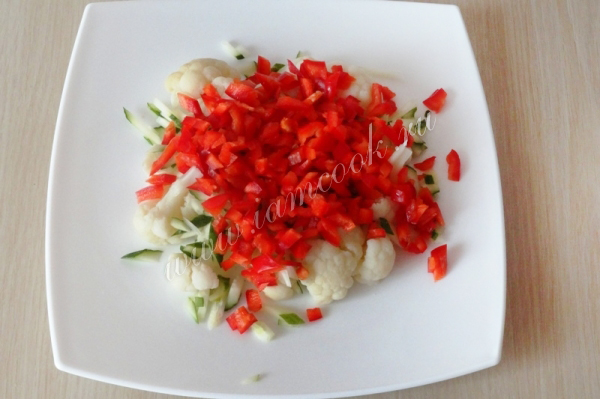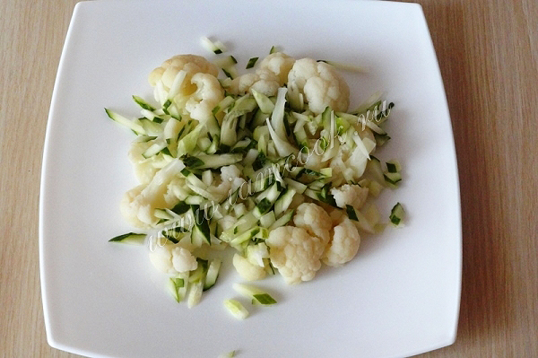Цветную капусту для этого салата не нужно разваривать до мягкости, достаточно будет 5 минут варки и затем сразу же необходимо облить холодной водой. Таким образом капуста не развариться и получиться немного с хрустом, так называемая "аль-дентэ". Вместо сметаны можно заправить обычным сладкий йогуртом или кефиром, но без вкусовых добавок.