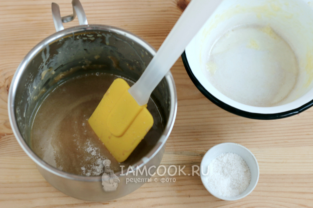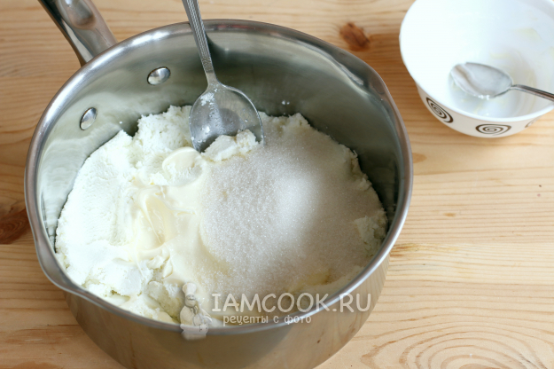 А пока остывает карамель, займемся творогом. Протрем его через сито в кастрюлю, в которой будем заваривать массу. Добавим мягкое сливочное масло, сахар и небольшую щепотку соли. Тщательно смешаем ложкой, растирая сахар.
