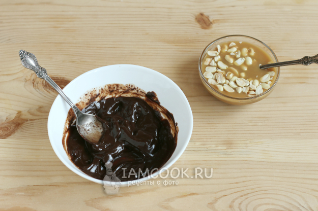 Смешаем в миске остывшую творожную массу, карамель с арахисом и шоколадную глазурь. Оставим немного глазури и арахиса для украшения. Вымешивать массу до однородности не нужно.