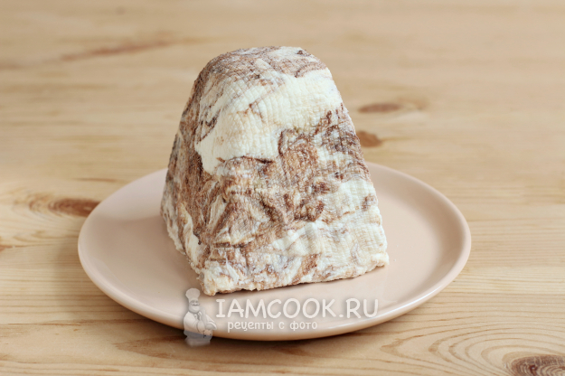 Утром достаем конструкцию, снимаем груз, разворачиваем марлю, кладем тарелку и переворачиваем пасху с тарелкой. Снимаем пасочницу. Вот такая пасха должна получиться, остается только украсить ее по своему желанию.