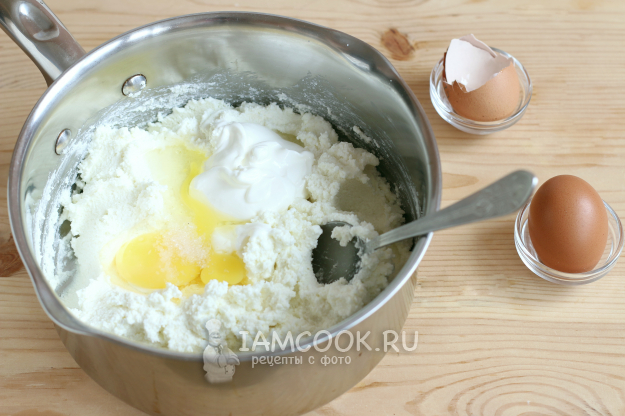 Затем добавим сметану и яйца по одному, вымешивая после каждого яйца. Поставим кастрюлю на плиту и на среднем огне будем постоянно растирать массу ложкой, нагревая ее до первых пузырьков. На это уйдет примерно 4 минуты.