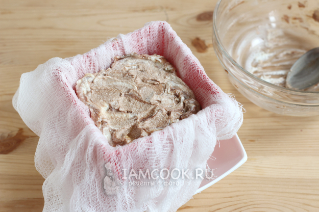 Пасочницу застелем сложенной марлей в 2-3 слоя и выложим в нее творожную массу.