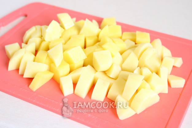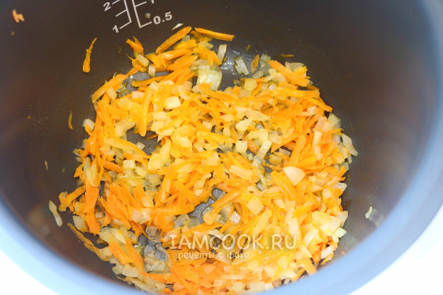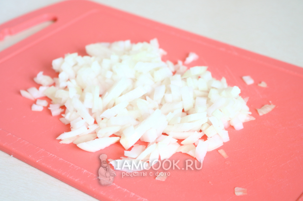 Подготовьте овощи: помойте и очистите при необходимости. Мультиварку установите в режим «Выпечка». Лук нарежьте мелким кубиком и сразу отправляйте в чашу вместе с растительным маслом.