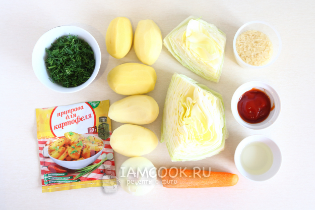 Для приготовления тушеной картошки с капустой и рисом в мультиварке нам потребуются следующие ингредиенты.