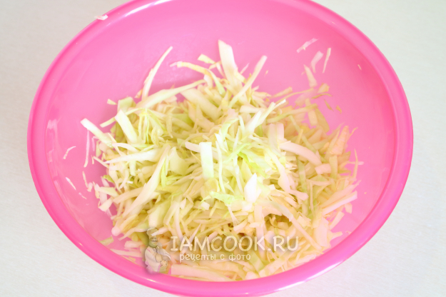 У капусты удалите кочерыжку и вялые верхние листья, затем нашинкуйте капусту и помните руками до мягкости.
