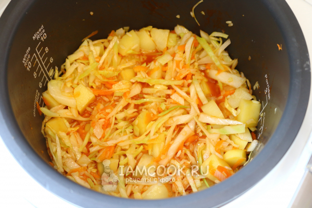 Выложите капусту в чашу к овощам и рису. Добавьте кетчуп (либо томатную пасту). Влейте ещё 1,5 мультистакана жидкости. Перемешайте и тушите под крышкой до готовности 15-20 минут.