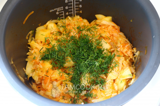 В конце приготовления добавьте в чашу мелко нарубленный свежий укроп. Посолите и поперчите по вкусу. Выключите мультиварку и оставьте блюдо с закрытой крышкой на 10-15 минут.