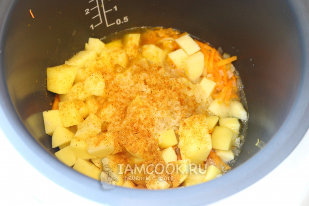 Выложите в чашу вместе с промытым рисом. Всыпьте приправу для картофеля по вкусу, влейте мультистакан горячей воды. Перемешайте, закройте крышкой и оставьте готовиться на 7-10 минут.