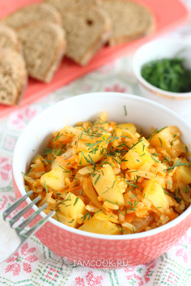 Тушеная картошка с капустой и рисом в мультиварке готова! Подавайте к столу с хлебом, посыпав свежей зеленью. Приятного аппетита!