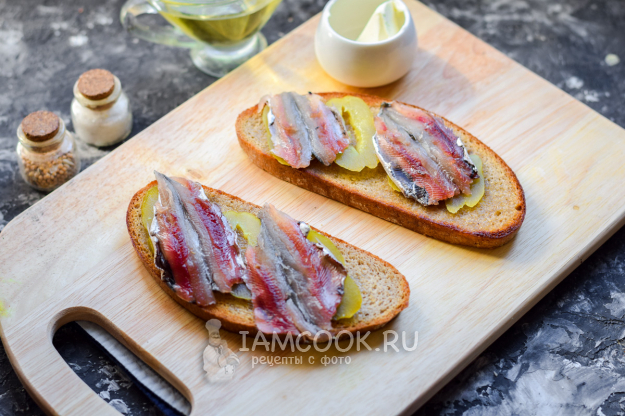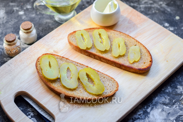Соленые огурцы нарезать пластинами. Выложить огурчики поверх хлеба.
