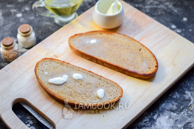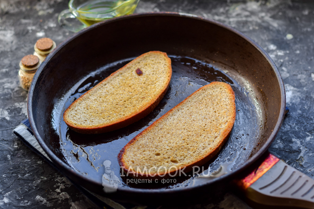 Сковороду хорошо прогреть, слегка смазать растительным маслом и выложить ломтики черного хлеба. Жарить хлеб с каждой стороны по несколько минут - до румяности.