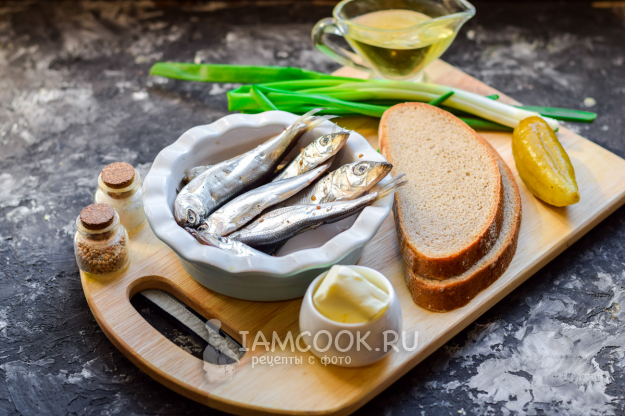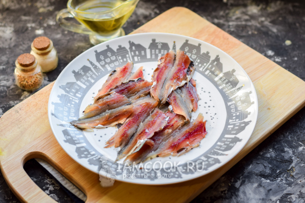 Пряную кильку необходимо почистить, оставить только филе рыбки.
