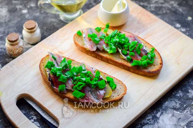 Зеленый лук сполоснуть и просушить, нарезать мелко и посыпать щедро каждый бутерброд. Готовые аппетитные бутерброды можно сразу подавать к столу.