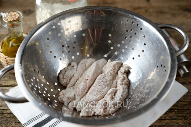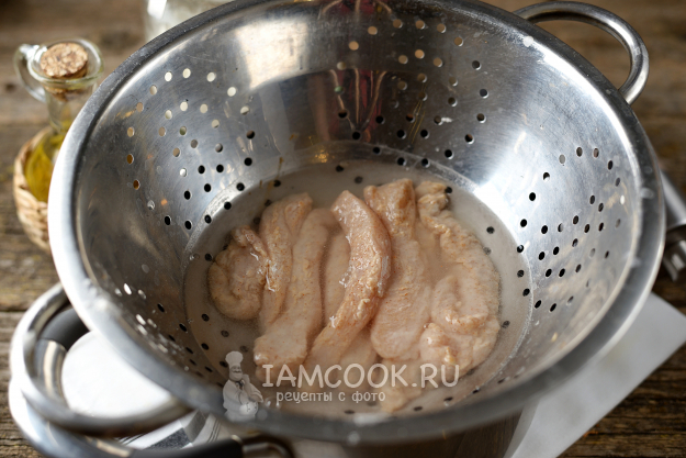 Быстро опустите запанированную курицу в большую кастрюлю с водой. Как только на поверхности появятся пузырьки, поднимите дуршлаг и дайте стечь всей воде.