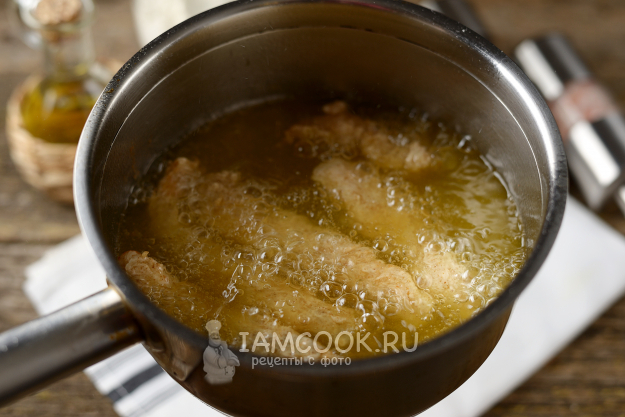 Обжарьте во фритюре минуты 3-4 на умеренном огне. Приподнимите вилкой или шумовкой один стрипс, как только панировка станет румяной и хрустящей - все готово. Не держите долго, иначе куриное филе станет сухим, а панировка - горькой.