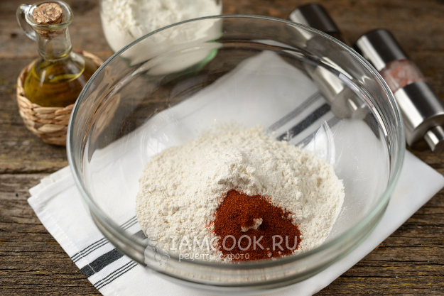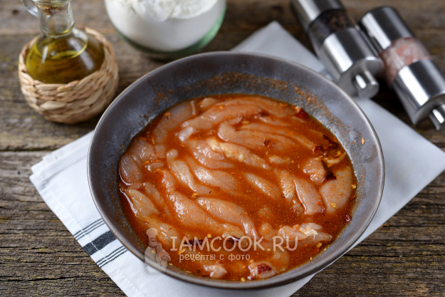 Мариновать филе мы будем в тех специях, которые чаще всего можно встретить в похожих рецептах. Сложите все специи в глубокую миску, поломайте мелко острый перец, всыпьте щедрую щепоть соли и черного перца, влейте полстакана воды, размешайте маринад. Все специи кладите неполными чайными ложками.