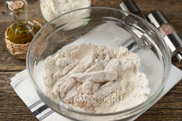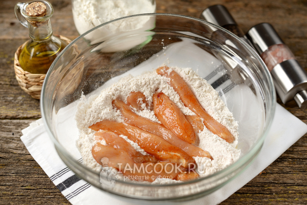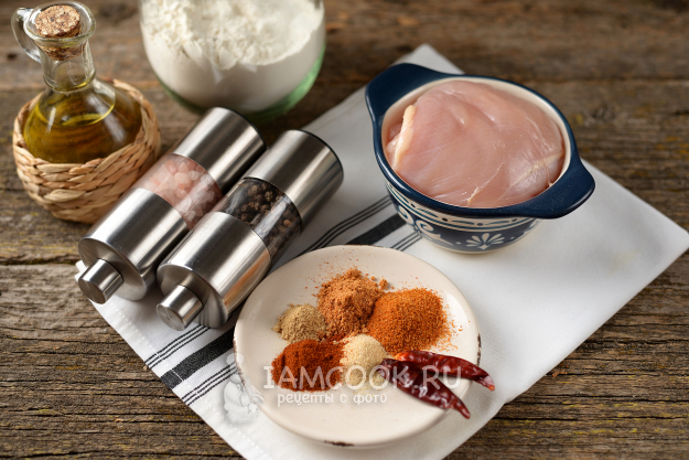 Подготовьте все необходимые продукты для приготовления куриных стрипсов как в KFC. Куриное филе помойте, обсушите насухо.