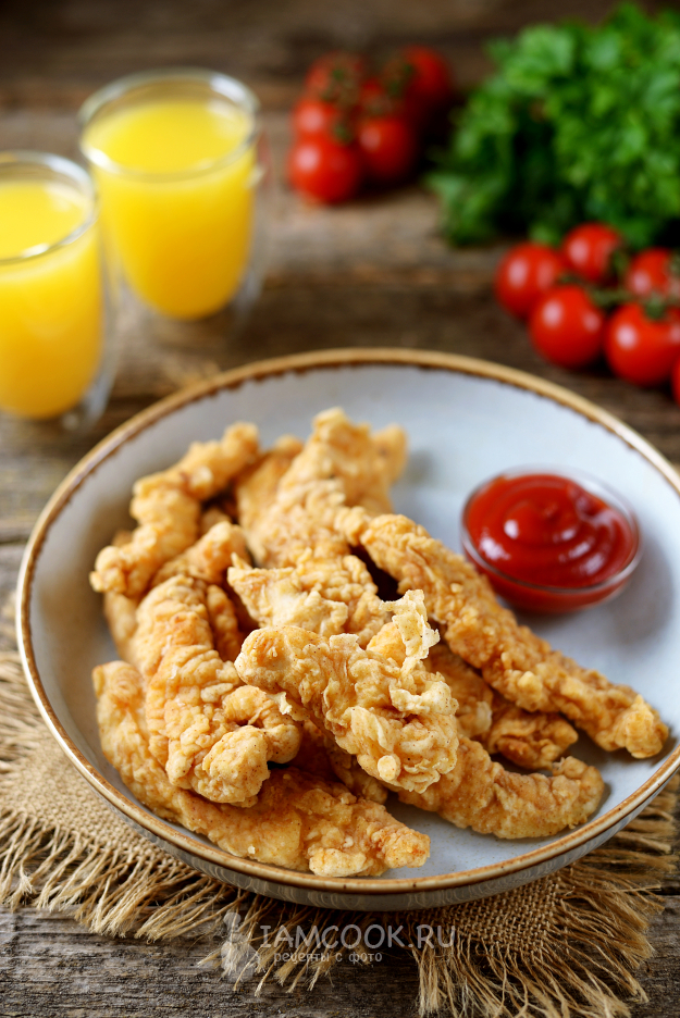 Куриные стрипсы как в KFC готовы. Сразу же подавайте к столу с любимым напитком, соусом, свежими овощами и зеленью.