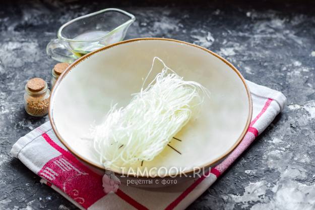 Фунчозу переложить в миску, залить кипятком и оставить на 4 минуты, после воду слить.