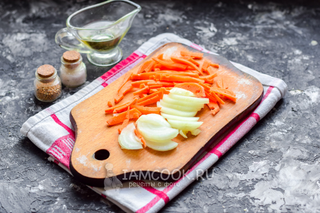 Очистить морковь и репчатый лук, овощи сполоснуть и просушить. Нарезать морковь полосками, лук нарезать полукольцами.