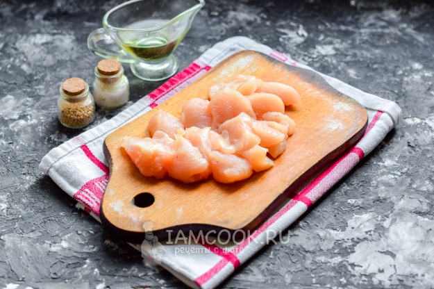 Куриное филе ополоснуть и просушить, нарезать небольшими кусочками.