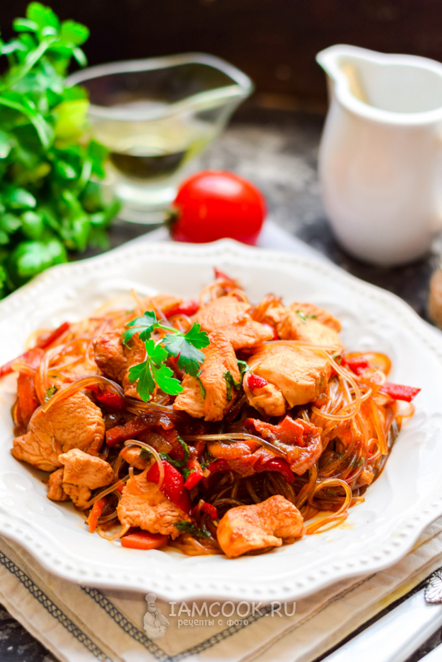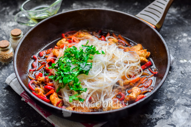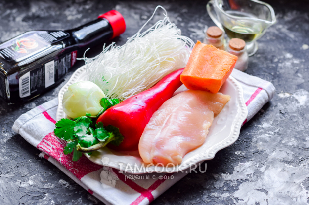 Подготовить все продукты для фунчозы с курицей и сладким перцем.