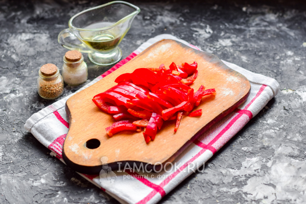Сладкий перец очистить и сполоснуть, нарезать полосками.
