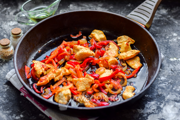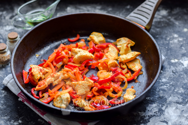 В сковороде прогреть немного масла, выложить лук и морковь, перец и куриное филе. Жарить ингредиенты 8-10 минут.