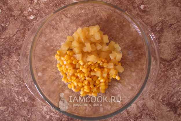 Соедините консервированные ананасы, нарезанные кубиком, с консервированной кукурузой.